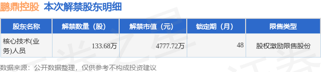 证券之星消息,根据市场公开信息整理,鹏鼎控股(002938)于7月10日将有133.68万股限售股份解禁,为公司股权激励限售股份,占公司总股本0.06%。(本次数据根据历史公告整理得出,实际情况以上市公司最新公告为准)本次解禁后,公司还有1126.93万股限售股份,占总股本0.49%。具体如下图所示: